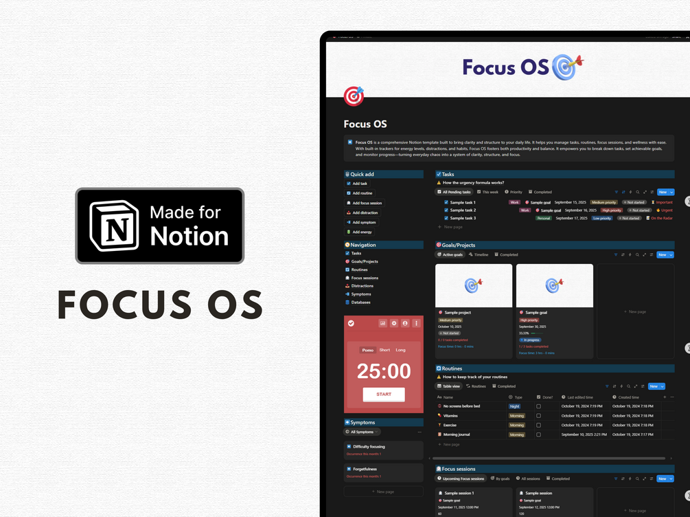 Focus OS blends productivity with self-awareness. By combining tasks, routines, focus sessions, and wellness tracking in one place, it helps you get things done without burning out. You’ll not only make progress on your goals but also learn how your energy, distractions, and health impact your focus—giving you a system that works with you, not against you.