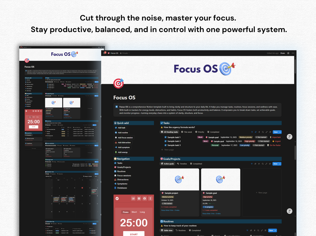 Focus OS is your all-in-one system for clarity, structure, and balance. Designed in Notion, it helps you move from scattered thoughts to focused action with tools that connect goals, habits, and daily energy.