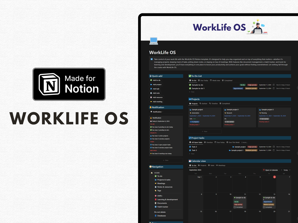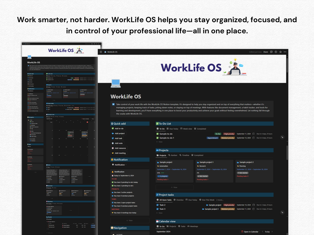 Welcome to WorkLife OS, your all-in-one workspace designed to streamline every aspect of your professional life and help you boost productivity. This comprehensive template has everything you need to manage projects, track tasks, store important documents, and support both your personal and professional growth.