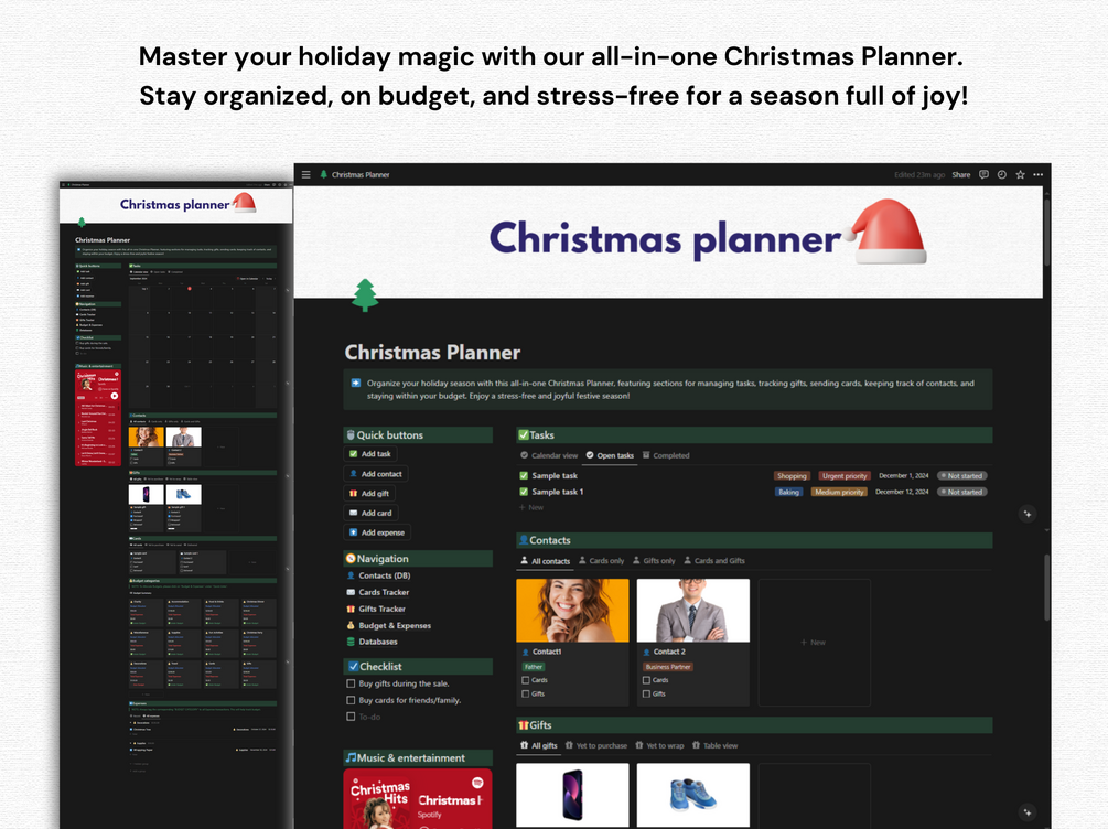 - Budget & Expenses: Stay on top of your holiday spending with a detailed budget and expenses tracker. Plan for gifts, decorations, and more, and compare your spending to your budget to avoid financial stress after the holidays.